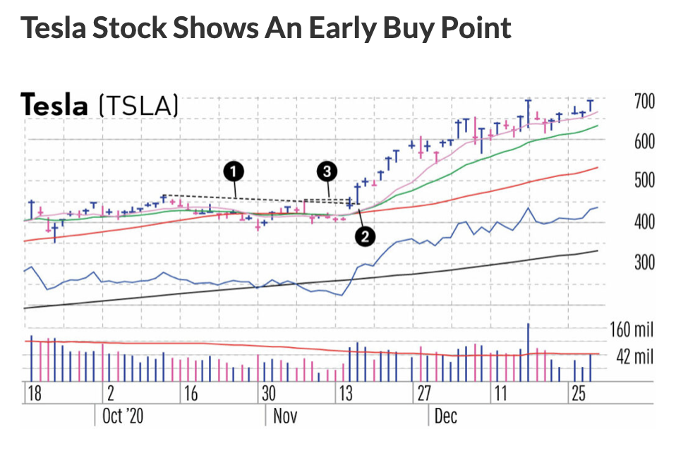 2020年秋季,特斯拉(TSLA)形成了一个不规则的杯柄形态,常规买入点为466美元。通过连接10月14日高点与11月9日高点的趋势线(1),一个约450美元的激进买入点浮现(2),比常规买入点低约3.5%(3)。2020年11月17日,特斯拉股价突破450美元的早期买入点。次日,股价突破常规买入点466美元。到2021年1月25日,特斯拉股价达到历史高点900.40美元(在3:1拆股前),较466美元买入点上涨高达93%。然而,IBD于1月8日的“每日股票”栏目指出,特斯拉股价接近垂直上涨,出现高潮顶部的迹象。果然,2021年2月,特斯拉开始长期回调。