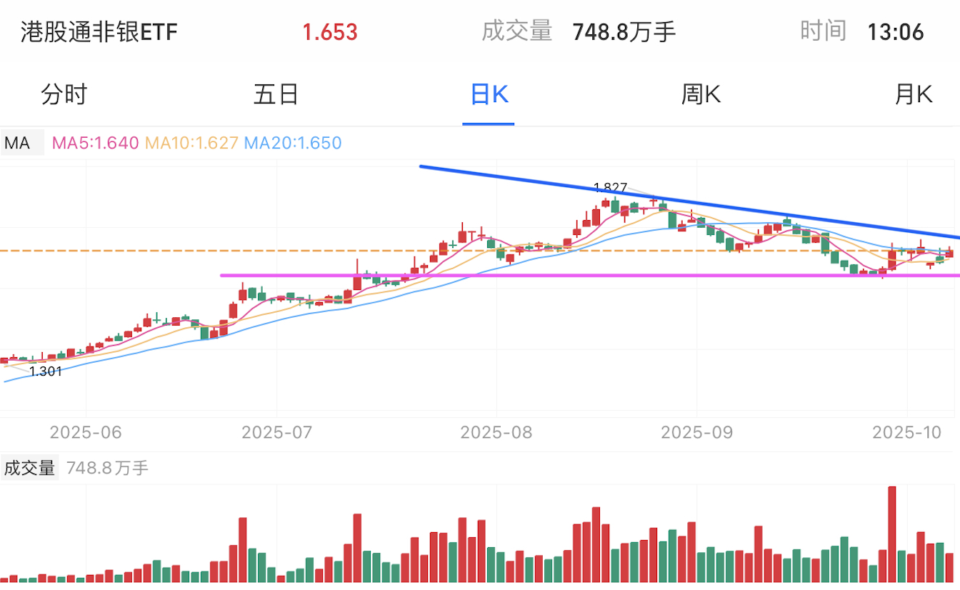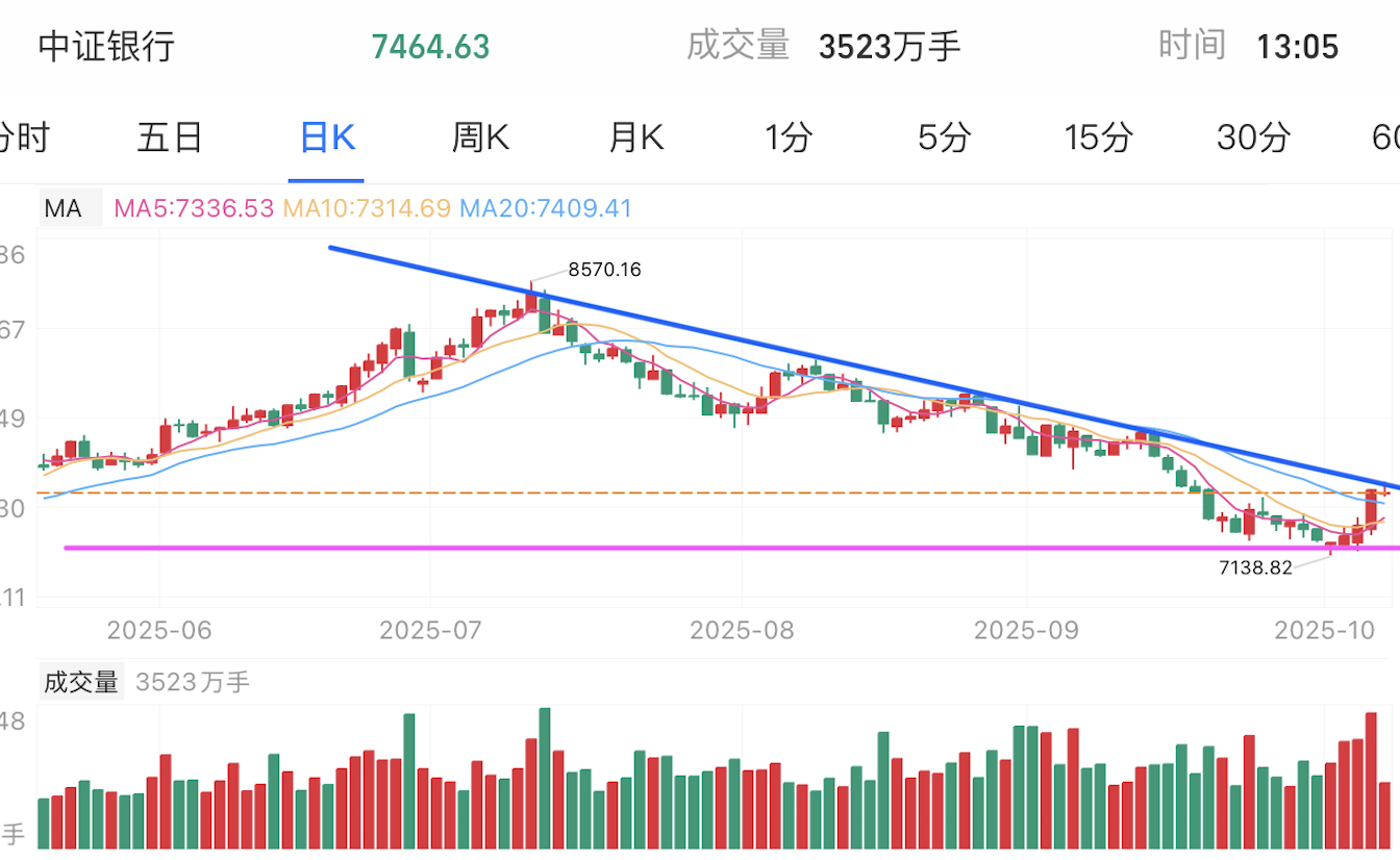 银行近期震荡下行趋势。这几日出现放量上涨,有止跌回升迹象,今日涨跌幅不大,没有突破下跌趋势线,还不能确定就此回升。今日非银金融反弹,有止跌横盘迹象。