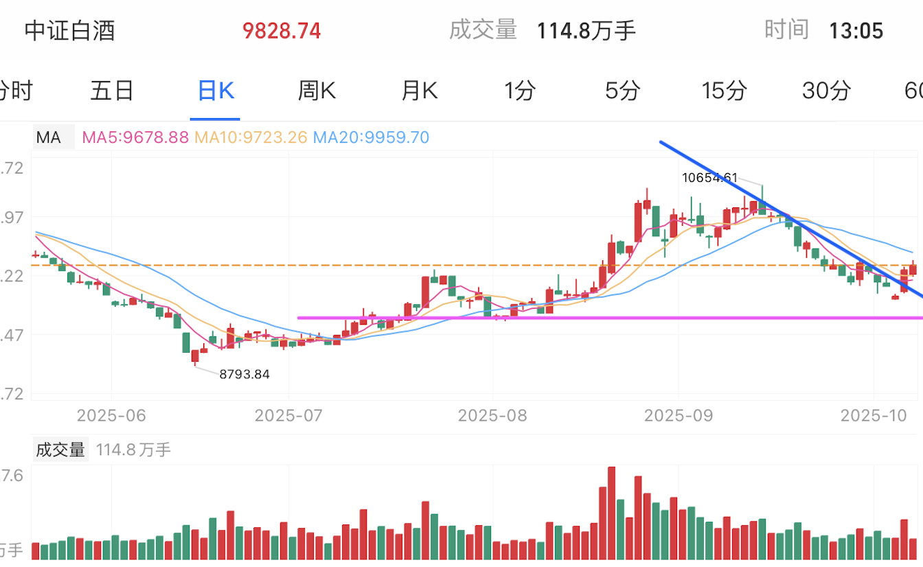 白酒此前在短暂反弹后回落,最近再次反弹,突破下跌趋势线,有止跌回升迹象,但涨幅不大,交易量不高,还不能完全确定。