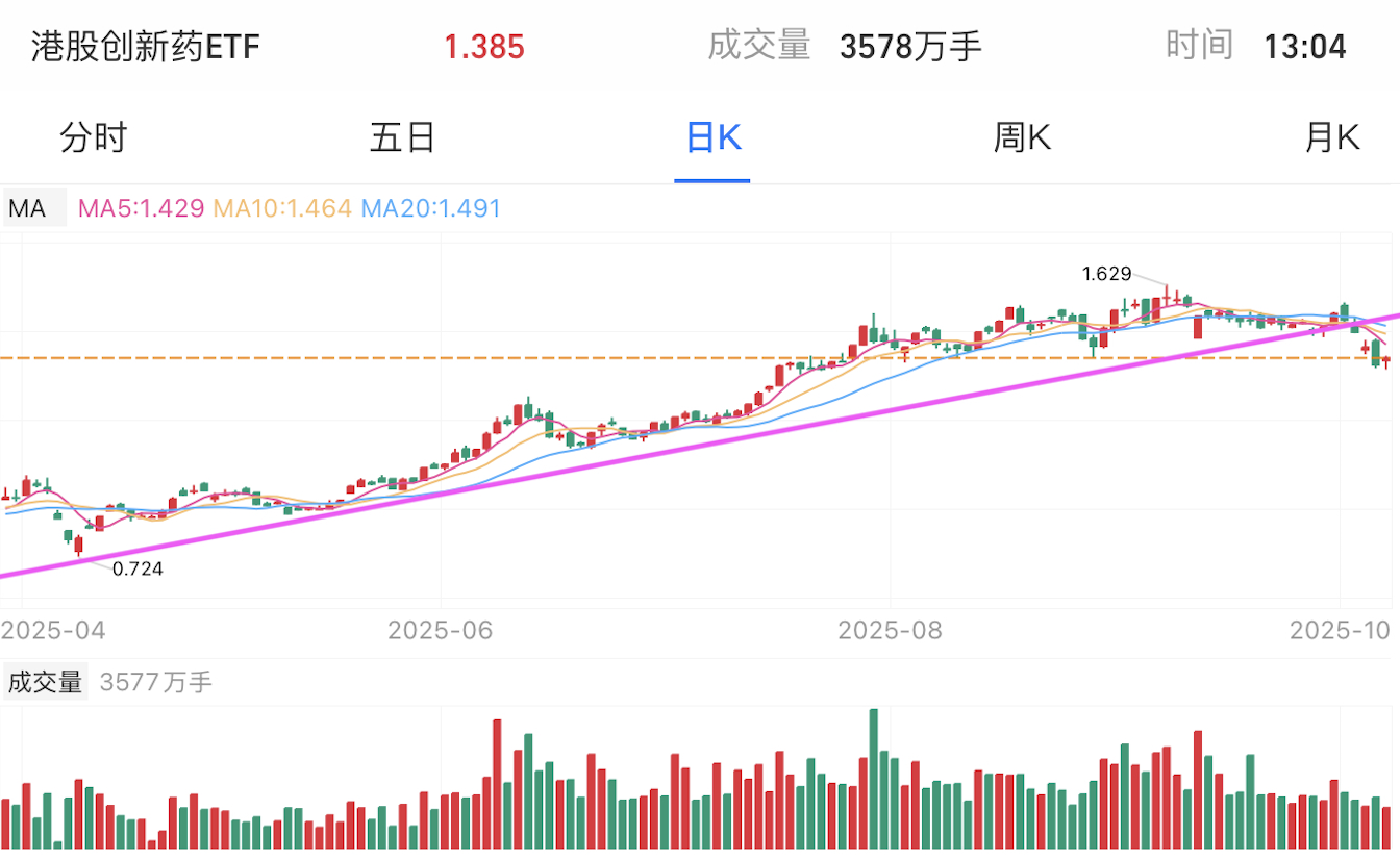 创新药和港股创新药近期大幅上涨,后力竭盘整,这几日跌破中长期上涨趋势线。今日反弹,不能确定止跌回升。