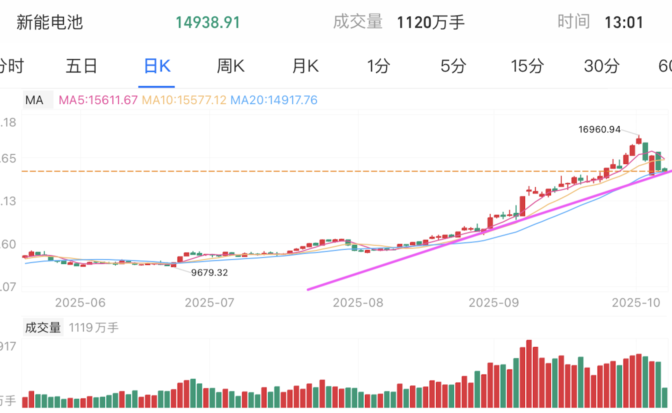新能电池近期有一波上涨,在大幅拉升后力竭回调,跌破第一道防线,目前跌至中长期上涨趋势线附近,能否守住支撑决定后市走向。