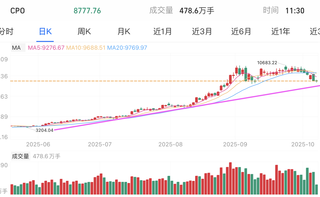 通信(CPO)近期有一波大行情,涨幅大,后高位盘整。最近几日连续大幅下跌,还伴随放量,今日继续下行,靠近中长期上涨趋势线,如果无法守住,那么此次行情结束。