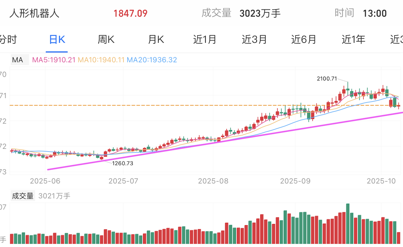 人形机器人近期一直震荡上行,有一波较大行情。最近几日较大幅度下跌,已经跌破第一道支撑,逐渐靠近中长期上涨趋势线。今日反弹,还不能确定止跌。