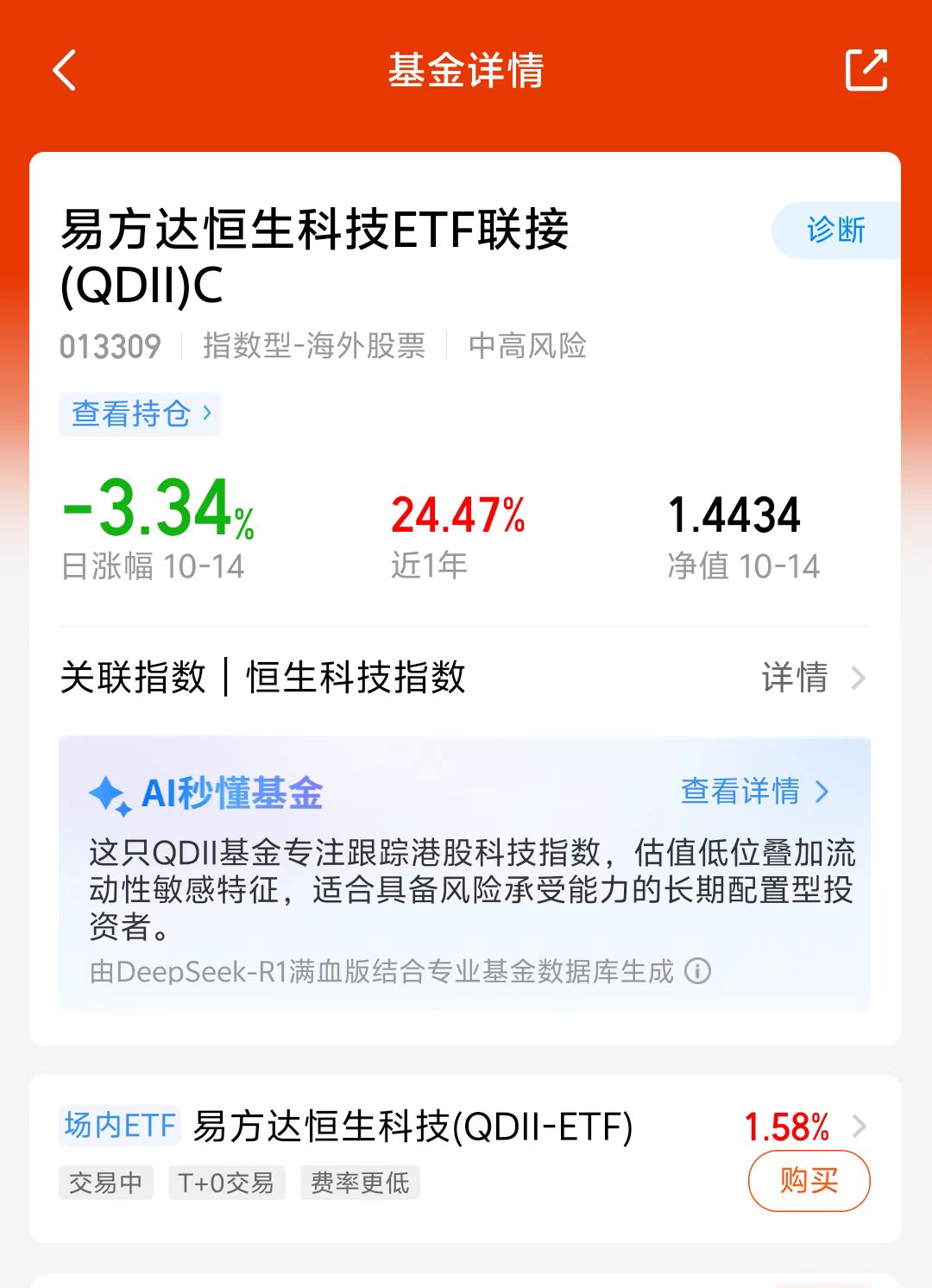 大盘今天涨起来了,港股表现也不错,恒生科技今天涨了不少!中长期来看,港股科技板块相比A股和美股仍处于低位,具备性价比,补涨空间很大,今天继续加仓$易方达恒生科技ETF联接(QDII)C(OTCFUND|013309)$,近一年涨了24.47%,看好这个方向,我准备分批布局!