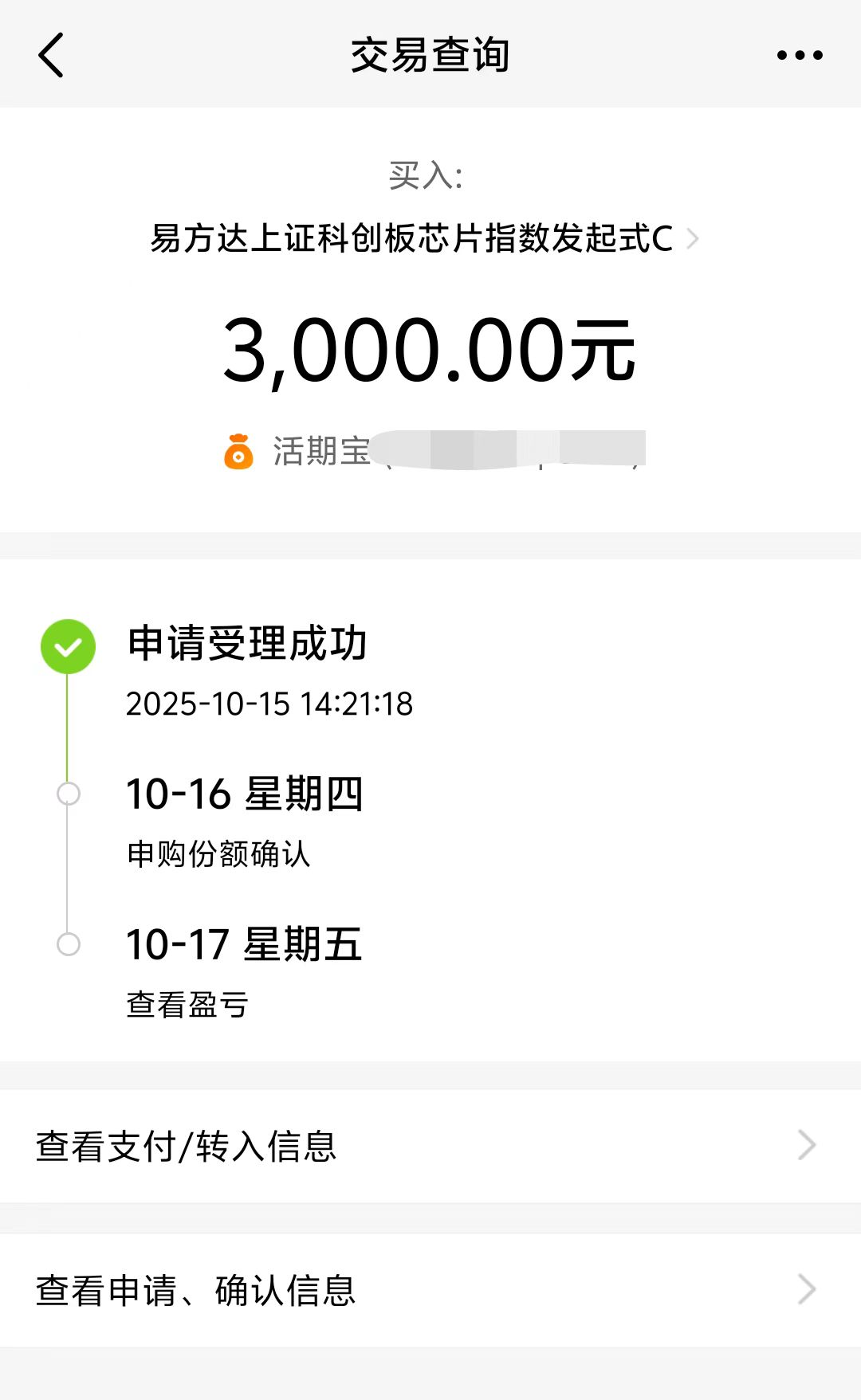 大盘今天上涨,科创芯片板块经过前几天震荡回调之后,今天涨起来了,近期调整的差不多了,今天加仓$易方达上证科创板芯片指数发起式C(OTCFUND|020671)$3000元,近一月涨了9.38%,近三个月涨了53.83%,近一年涨了82.59%,不论是短期还是中长期业绩都很不错,看好这个方向,我准备分批加仓了。