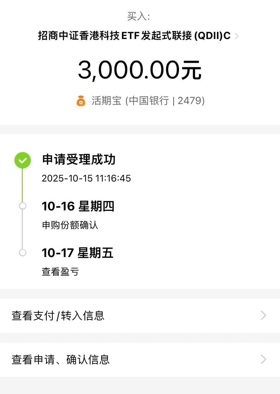 之前受外围AI“泡沫”讨论和贸易摩擦升级影响,这只基金跟着恒生科技指数回调了不少,现在位置已经到了我觉得合适的区间。虽然短期市场波动率还在放大,但中长期看科技主线受影响有限,回调后反而有结构性机会,今天果断加了仓,打算布局后续行情。