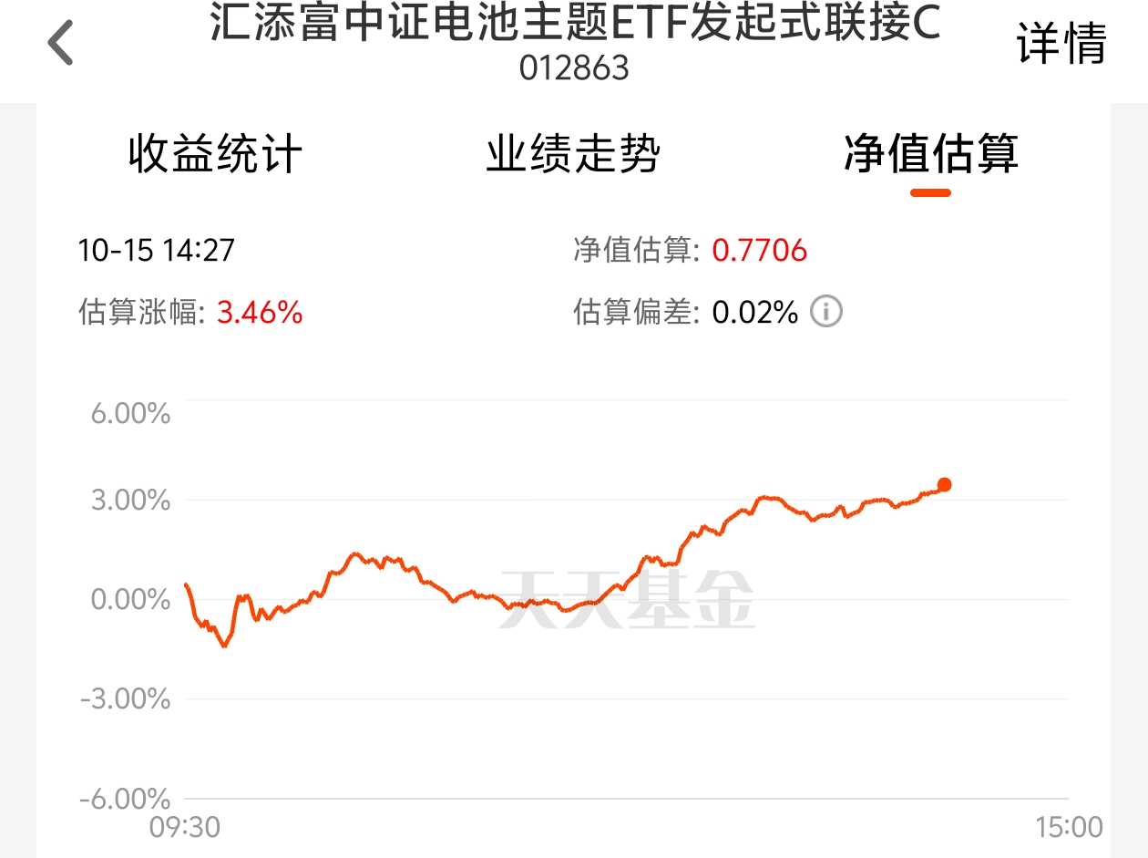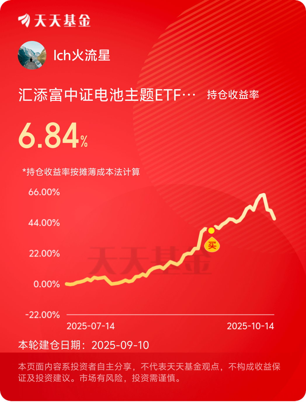 $汇添富中证电池主题ETF发起式联接C$ 流星最近入手的的汇添富中证电池,表现还是不错的,目前收益率6.84%,今天估值涨幅3.46%,最近电池还是比较火热的,市场回暖,电池首当其冲!真是太优秀了!汇添富中证电池,主要跟踪电池板块指数的,其不单单覆盖龙头电芯企业,也覆盖了电池材料、设备等中上游环节。弹性优势非常明显,在同类产品中尤为亮眼,能在行情启动时跟得住、甚至跑得快,而且费率还非常低。其业绩,近三个月涨幅46.67%,近六个月涨幅64.38%,其业绩真是没得说!随着市场行情回暖,流星相信,后市电池还会有所表现的!加油,干就完了