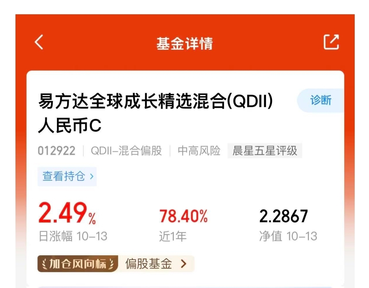 今天市场走势挺有意思,A股整体回暖但科技股还在调整,新能源倒是小有表现。美股昨晚也出现了小幅回落,感觉最近各个板块轮动特别快,光盯着一个市场确实不容易把握节奏。我持有的易方 达全球成长精选混合(QDII)人民币C倒是让我省心不少,因为它同时覆盖了A股、港股和美股三大市场的科技赛道。虽然短期有波动,但我认为科技行业的长期增长空间还很大,这个方向我依然保持乐观。这种全球化布局的产品,在市场轮动时确实能起到很好的平衡作用。