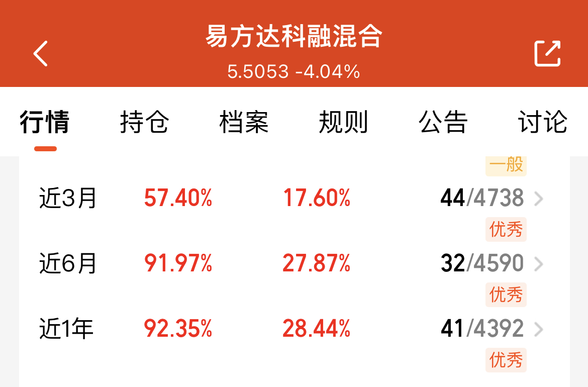 今日大盘回暖,大科技板块反弹上涨,但成长行情轮动节奏快,追热门赛道容易踏空。$易方达科融混合(OTCFUND|006533)$正好踩中这个点,持仓均衡覆盖科技、新能源、军工,既跟上轮动主线,又能降低单一赛道回调风险。它近三月涨57.4%、近六月涨91.97%,长周期夏普比率也很优秀,严控回撤的同时收益亮眼。眼下板块轮动正盛,我打算分批加仓这只“成长均衡选手”,既能蹭上行情热度,持仓体验也更稳。