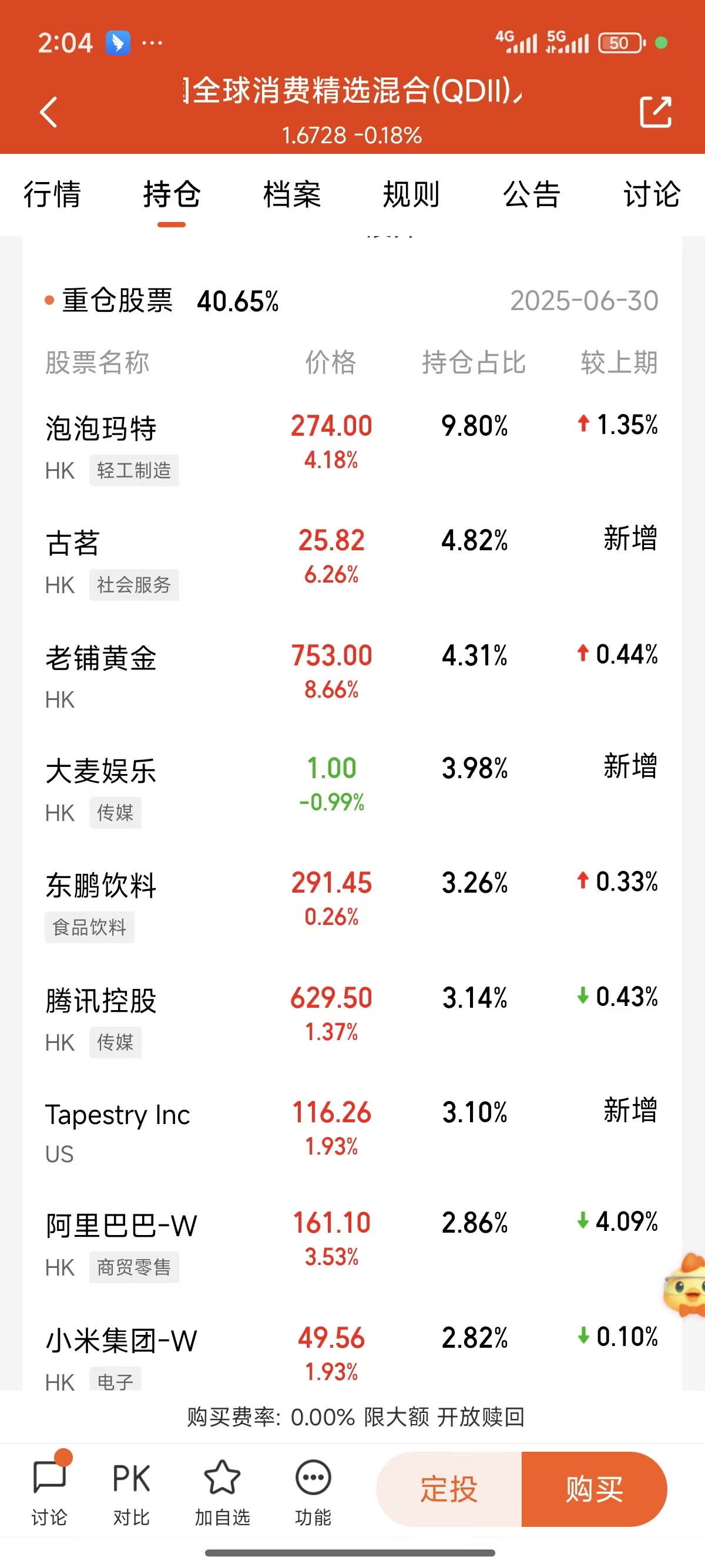 看持仓,泡泡玛特近期涨 4.18%、老铺黄金涨 8.66%、古茗涨 6.26%,这些重仓消费龙头要么业绩创新高,要么涨幅亮眼。像泡泡玛特,潮流玩具赛道的领军者,业绩持续增长;老铺黄金在黄金消费热潮中表现突出;古茗作为新式茶饮黑马,门店扩张和业绩都在快速突破。