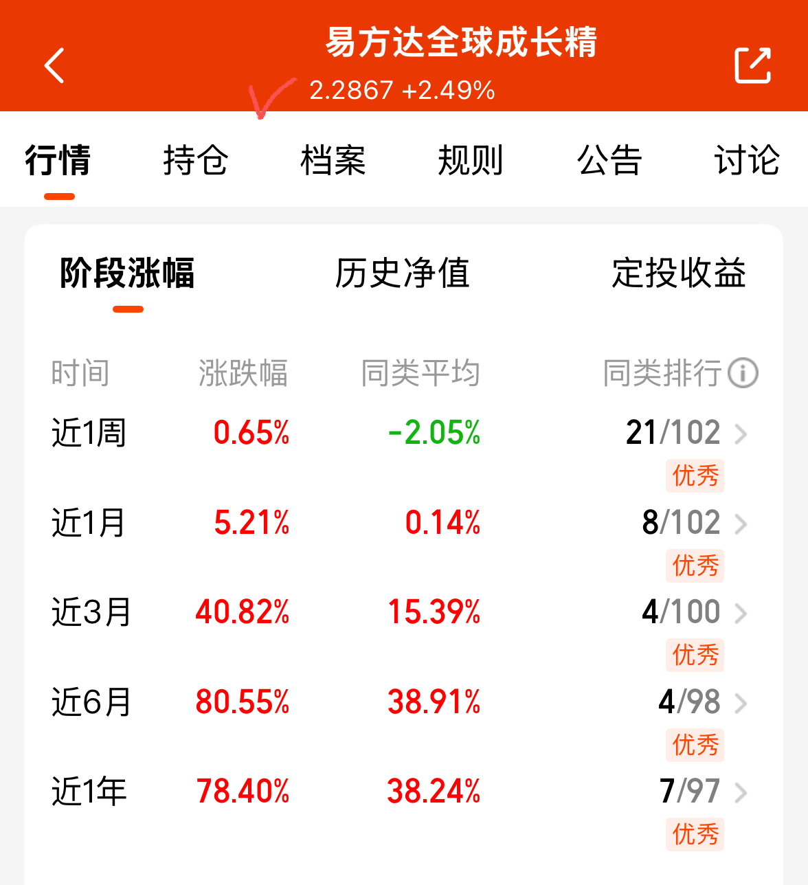 看了一下今天能回血2000+,操作上我没大幅度加仓。量能方面还不够,观察后面的行情。但是依旧看好大科技方向,$易方达全球成长精选混合(QDII)人民币C(OTCFUND|012922)$,这个就是全球科技策略的,能投美股科技,还有A股科技港股科技,单吊一个板块的风险较低。业绩表现一直都比较好,近一周0.65%,近一月5.21%,近三月40.82%,经理眼光非常不错,调仓的业绩各个维度都很ok。