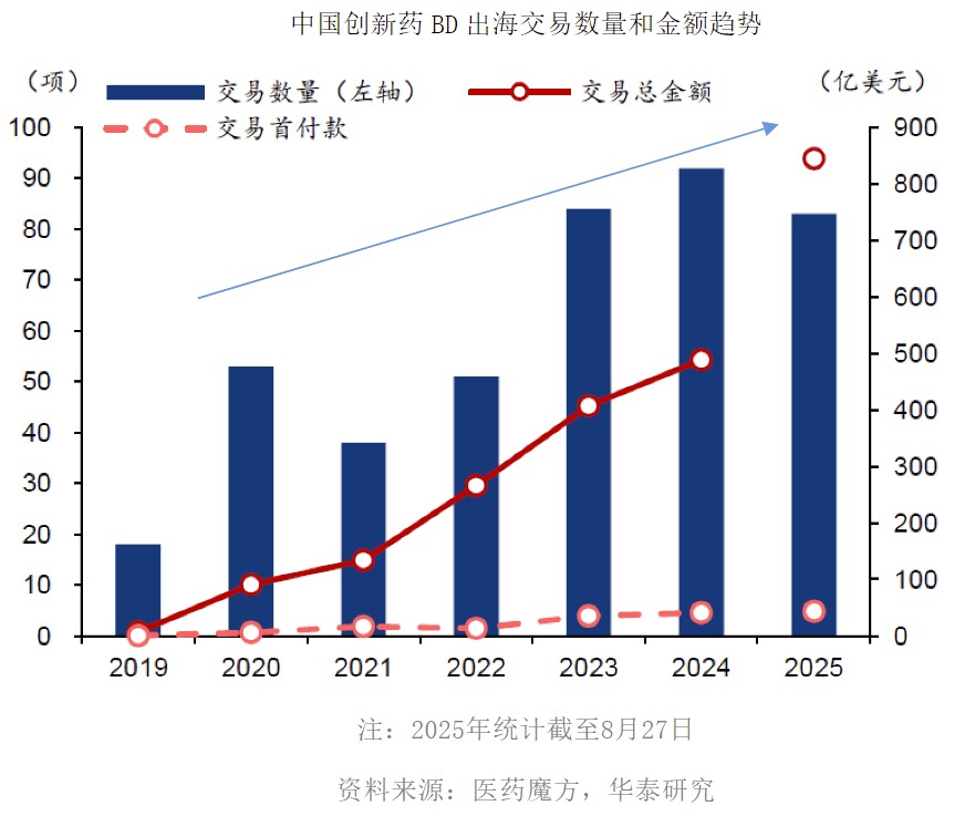 出海交易方面,2025年,国产创新药BD出海金额大幅增长。截至8月27日,国产创新药达成license out交易数量83项(2024年全年92项),披露总金额达845.31亿美元(2024年全年488.13亿美元),是全球创新药BD授权方中的主力。