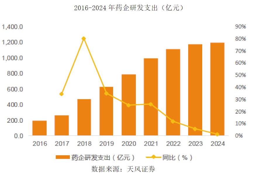 此外,研发方面持续发力,也推动了创新药的蓬勃发展。据天风证券数据显示,生物医药企业(A+H,包括传统制药及创新药企业)2016年整体研发费用为192亿元,2024年已经增长至1190.4亿元,CAGR达29.8%。持续的研发投入为创新药提供坚实的基础。