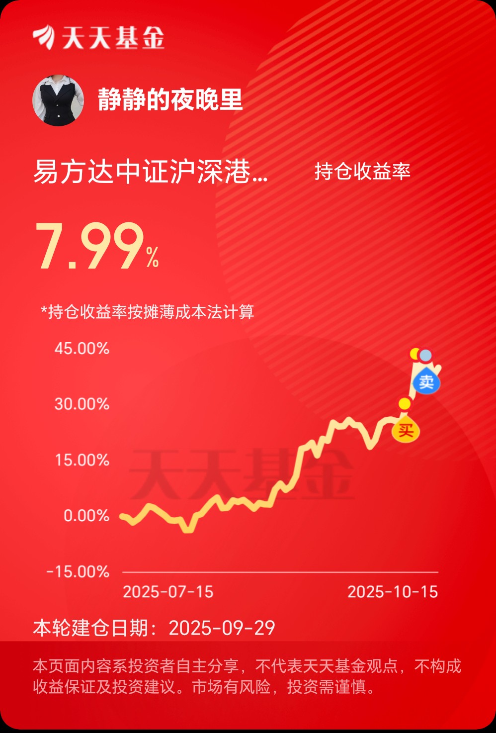 近期黄金这波行情真的是太香了,尤其是我持有的$易方达中证沪深港黄金产业股票指数发起式C(OTCFUND|021363)$自从上车之后,始终保持稳定上涨趋势,在持有期间体验感特别好,目前我的持有收益率也有7.99%,后期如果出现回调,我也会继续加仓,要知道这可是金价中的放大器,不但比黄金弹性更高,而且上涨空间也会更足!