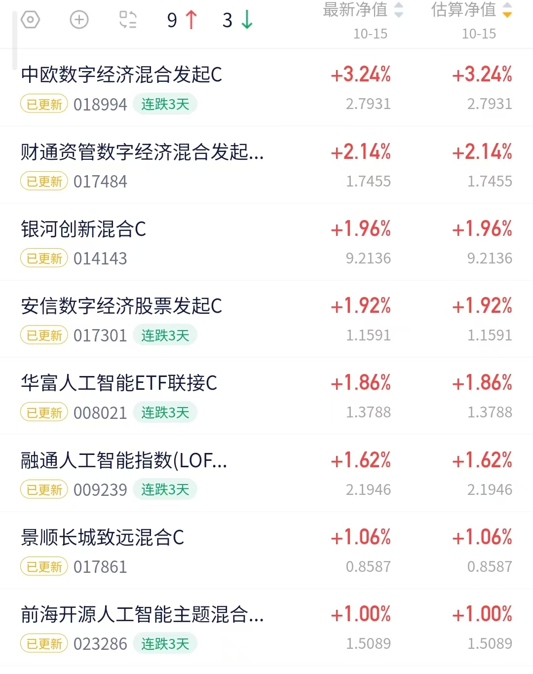 行情企稳回暖真的太开心了吧~感觉科技赛道又好起来了,感觉现如今行情低位可以适当补仓等待后续的回暖行情呀~我看$中欧数字经济混合发起C(OTCFUND|018994)$今天收涨3.24%还是很亮眼的哦~这里超额收益还是很不错的。