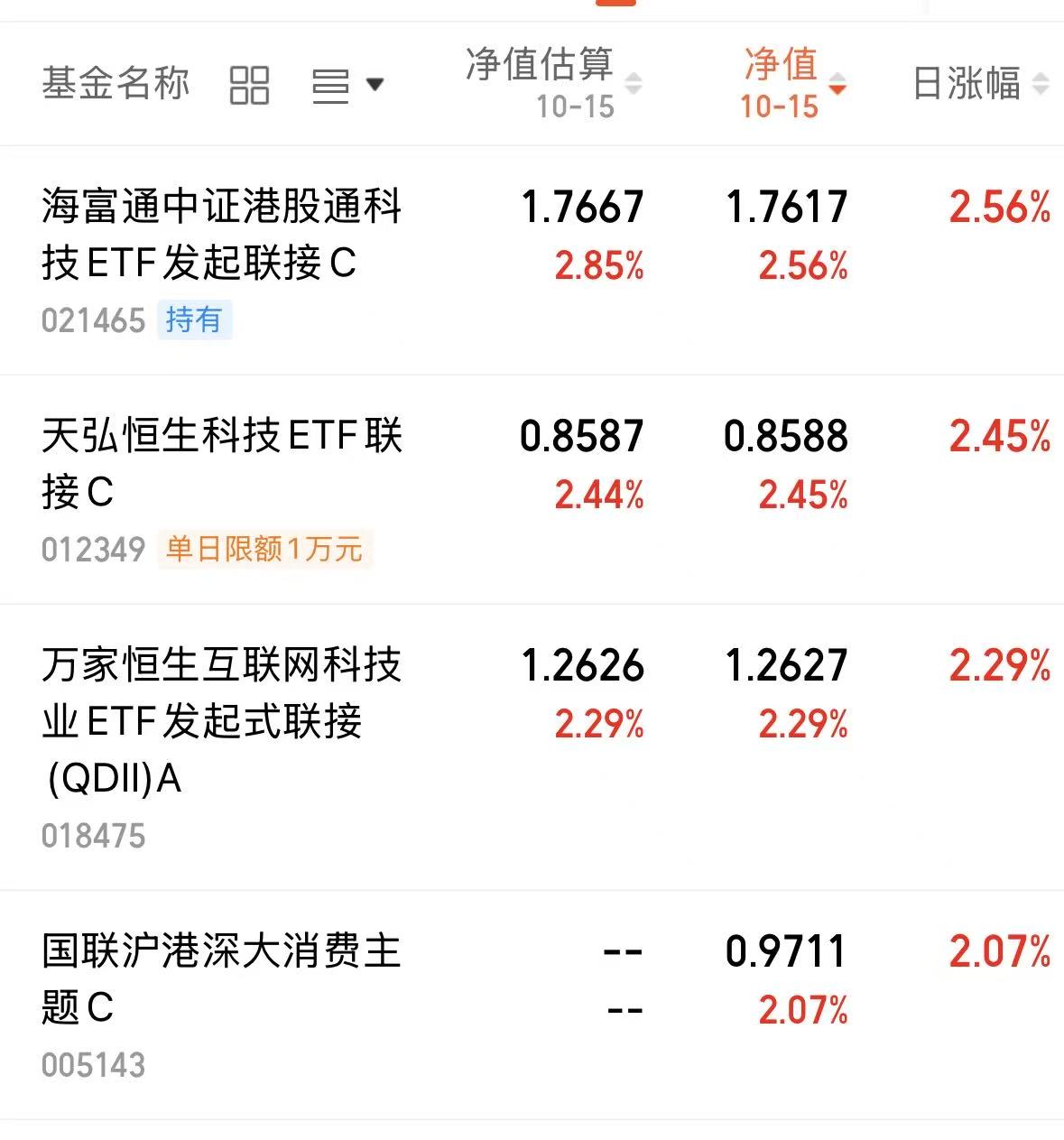 恒科终结7连跌,港股快把大家心态也搞崩了,今天大涨,$海富通中证港股通科技ETF发起联接C(OTCFUND|021465)$更新+2.56%,港股科技的科技含量要比恒科高一些。