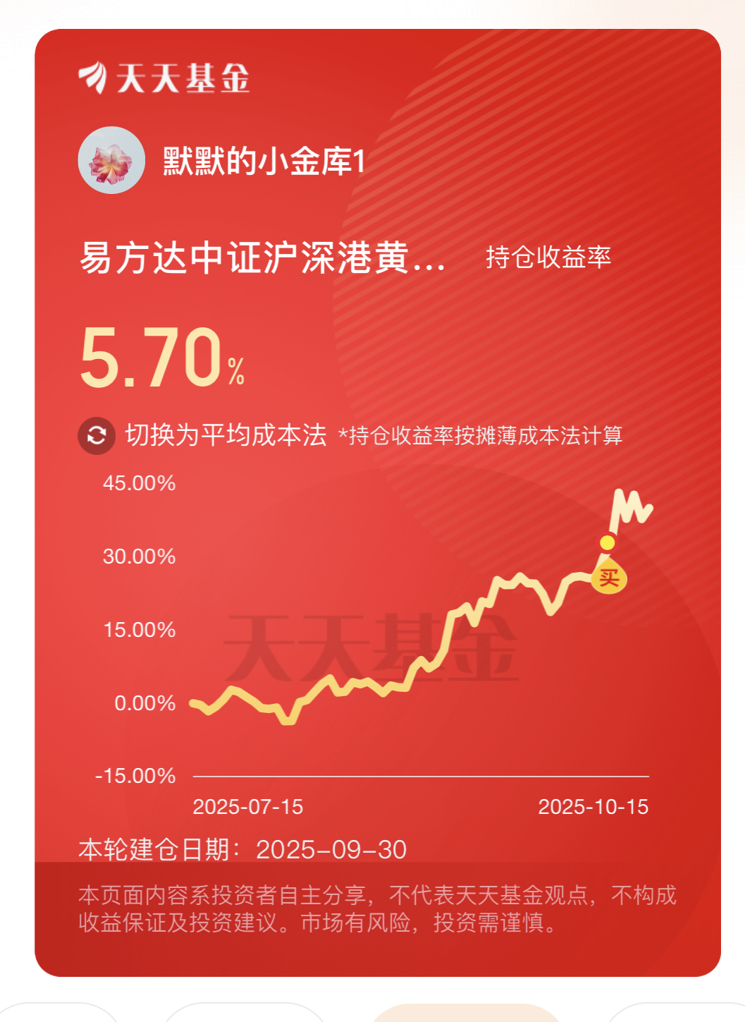 近期黄金行情持续走热,我持有的$易方达中证沪深港黄金产业股票指数发起式C(OTCFUND|021363)$表现尤为亮眼:今天上涨1.62%,近三个月涨幅39.69%,上车后走势稳涨,持有体验相当顺滑,目前收益率5.70%。这产品堪称金价的放大器,弹性比实物黄金更足,上涨空间也更可观。