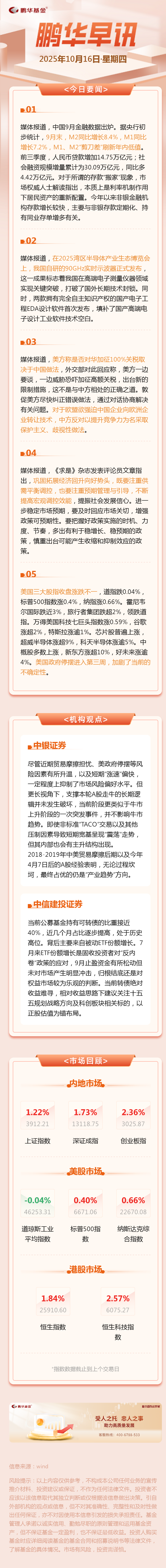 鹏华早讯10.16 中国9月金融数据出炉,M1、M2“剪刀差”刷新年内低值