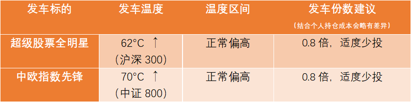 对应到发车温度方面,沪深300指数和中证800指数都在进一步升温,对应到两款我们的跟投策略的发车,要注意,都已经来到了正常偏高的水平,建议大家可以适度少投: