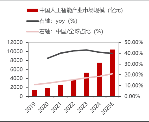 相关机构预测,2019 年-2025 年,中国人工智能产业市场规模有望从 1372 亿元增长至 10457 亿元,CAGR 达 40.28%,中国占全球市场占比有望从 11.00%提升至 20.90%。随着整个 AI 产业链技术的迭代升级及产业落地速度加快,AI 市场规模持续扩容,有望迎来行业加速扩容期。在“政策托底 + 需求爆发”双轮驱动下,人工智能产业链仍有巨大潜力。