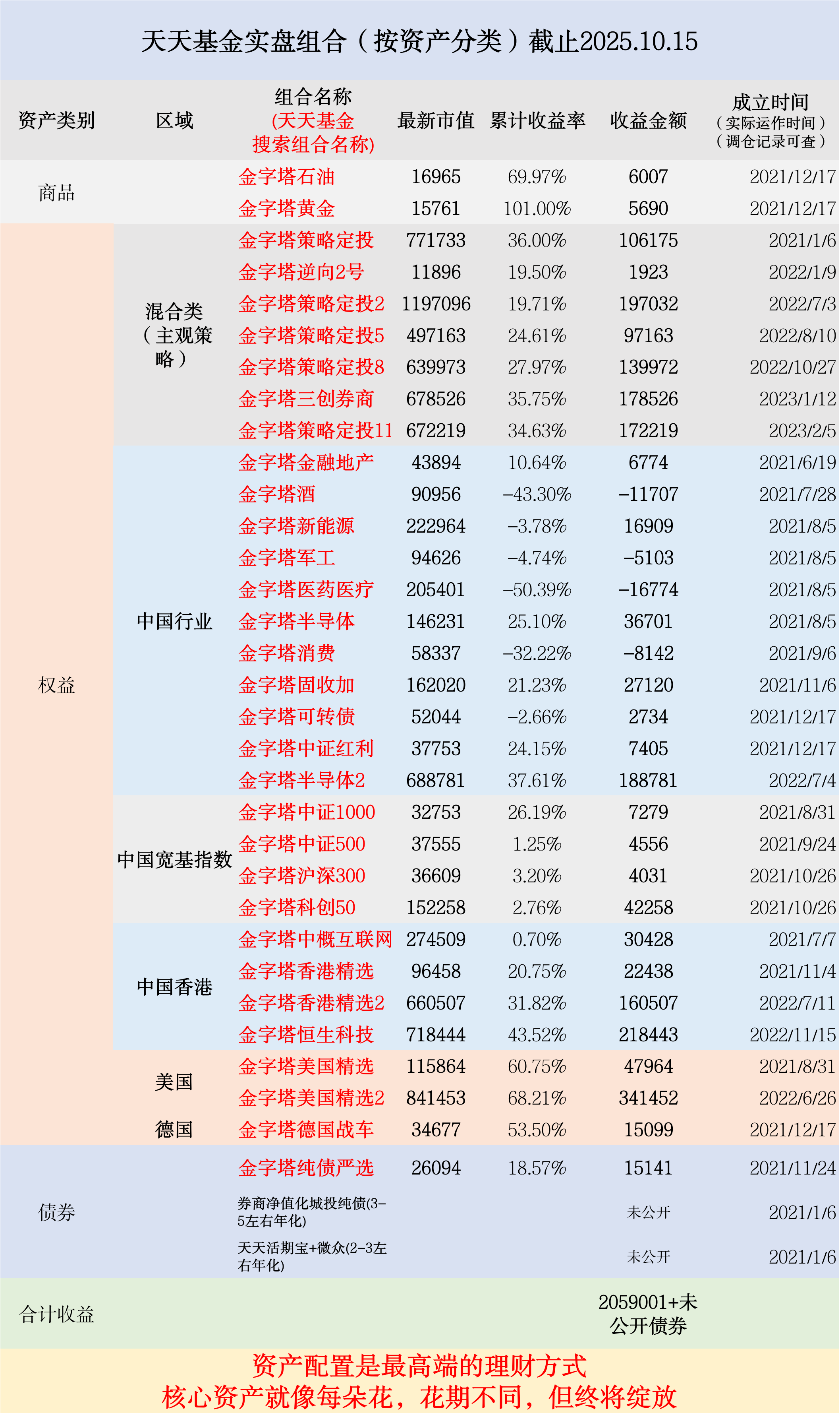 目前累计收益2059001+未公开债券收益,累计收益率排名前三的组合分别是黄金、石油、美国精选2;排名后三位的是医药、白酒、消费。收益金额排名前三的是美国精选2、恒生科技、策略定投2;排名后三的是医药、消费、白酒。