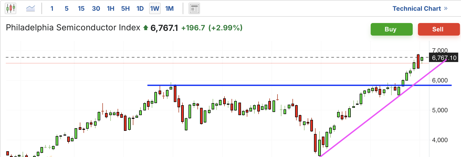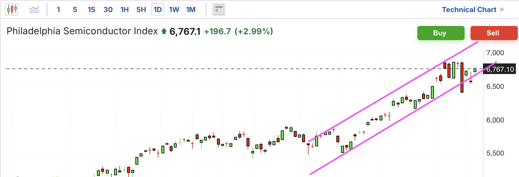 费城半导体近期趋势上行。前几日暴跌,跌破短期上涨趋势线,但很快反弹回来。从图形看,短期进入盘整,中期依然震荡上行趋势。