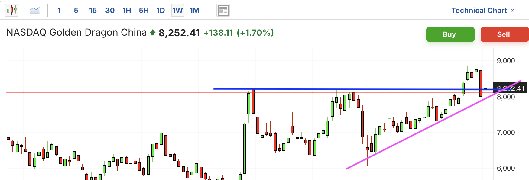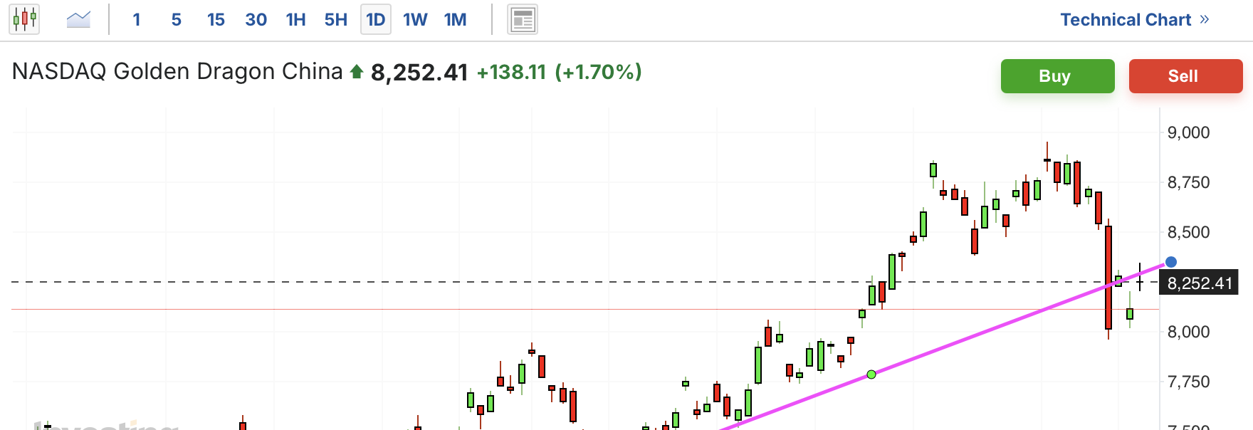 中概股此前突破压力位,反转向上,然而很快受阻回调。这几日守住短期上涨趋势线,有止跌横盘迹象,还不确定回升。