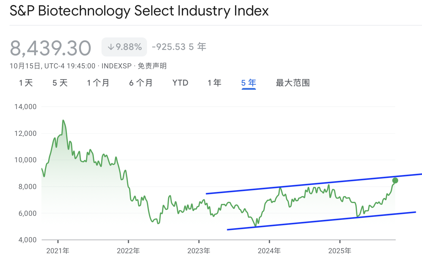 标普房地产中长期形成对称三角形,短期横盘震荡,后市方向仍不明。标普生物最近反转向上,这两日大幅拉升,突破前高压力位,靠近另一压力位。