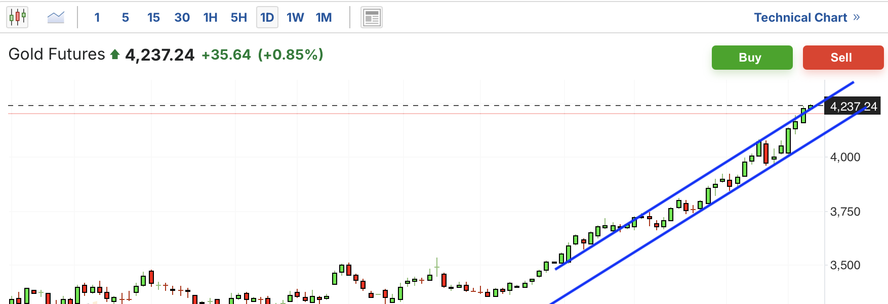 10年期美债收益率回落至4.03%。大宗商品方面,原油下跌0.7%至58.27美元/桶,黄金期货创下4235美元/盎司新高,年内涨幅达60%;白银期货上涨3.8%至52.52美元/盎司,年内累计上涨79%。