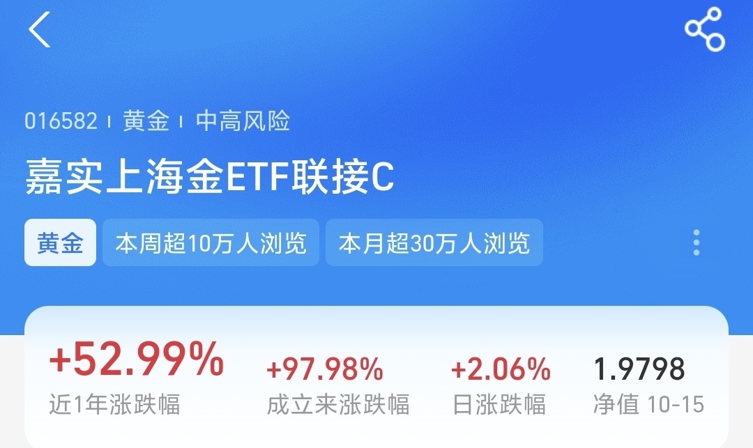 最近黄金行情太让人眼馋了,一路突破4200美元了!随着美联储要降息的预期越来越强,今天黄金价格又创下新高,不等了,我果断入手了$嘉实上海金ETF发起联接C$ 。这只基金昨天涨了2.06%,近一年涨幅更是涨到52.99%,表现很给力!而且它持有七天就能免手续费,费率还低,性价比不错,我特别看好它后续走势。