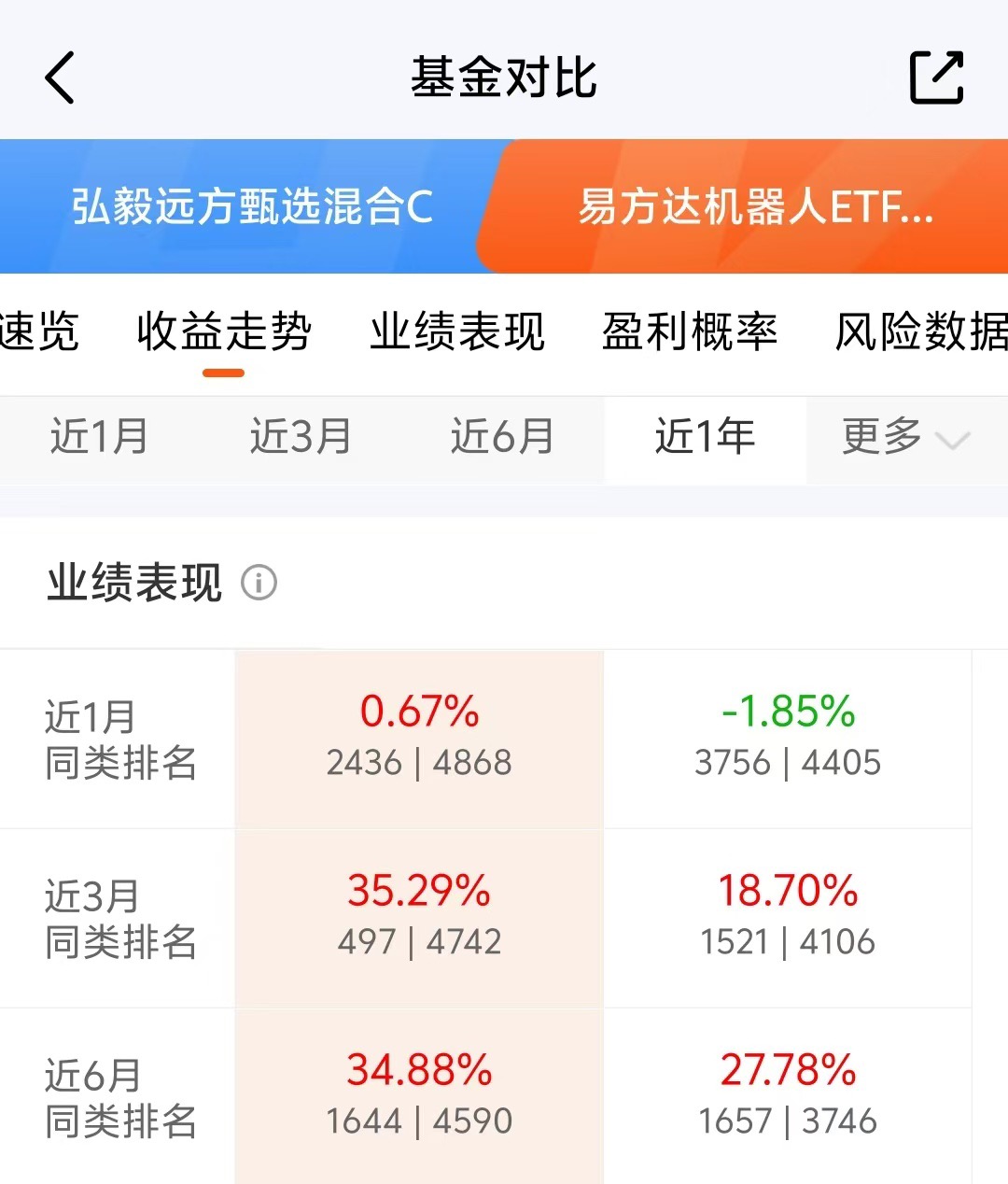 $宝盈华证龙头红利50指数发起式C$ $中银内核驱动股票C$ $中航机遇领航混合发起A$ 近期机器人相关基金表现亮眼,我持有的弘毅远方甄选混合C昨日收获4.58%的涨幅。这只基金近三个月上涨35.29%,走势相对稳健,在与鹏华、永赢等同类产品的业绩对比中表现领先。目前板块经历10%以上回调后,市场情绪逐步平稳,行业层面不仅有政策支持,商业化进程也在加速,且远期市场空间广阔,综合考量后,我今日进行了加仓操作。