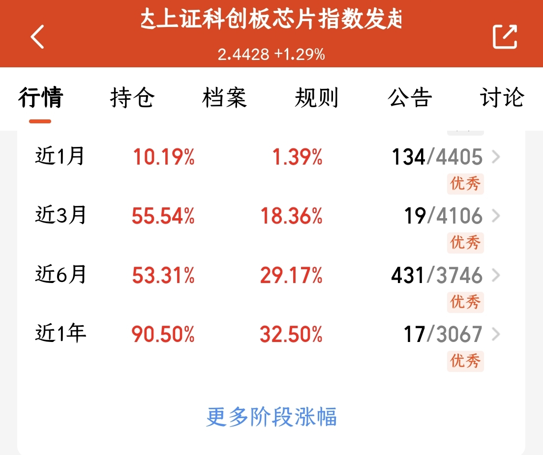 今天科创芯片低开高走,显示科技赛道正在复苏,还是比较强势的。选科创芯片基金时,优先考虑各阶段涨幅均明显领先的产品,例如那些近期连续跑赢基准的标的,比如$易方达上证科创板芯片指数发起式C(OTCFUND|020671)$,近一月涨幅10.19%,近三个月涨幅55.54%,近一年涨幅90.5%,远超同类均值。这能最大化收益,抓住市场反弹机会。今天继续加仓啦!
