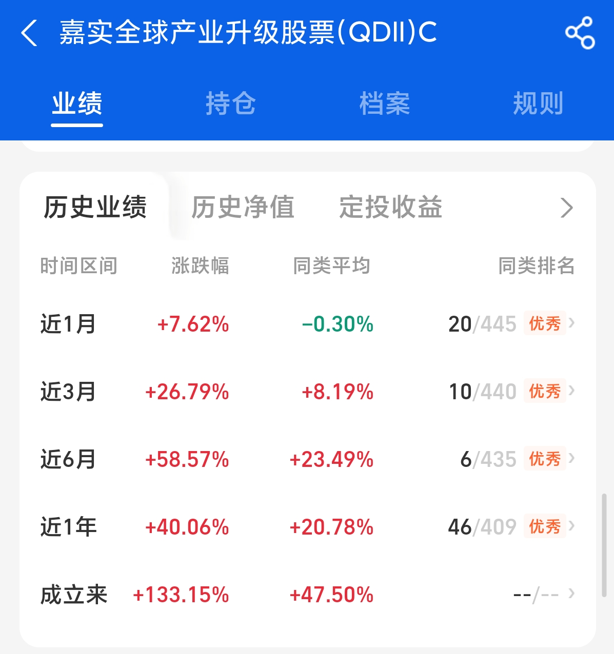 那么选择什么方向呢?个人看来$嘉实全球产业升级股票发起式(QDII)C$ 该基金主要聚焦美股半导体领域,还有大约30%的A股和港股芯片资产,注重资源领域投资,所以咱们不用担心业绩!