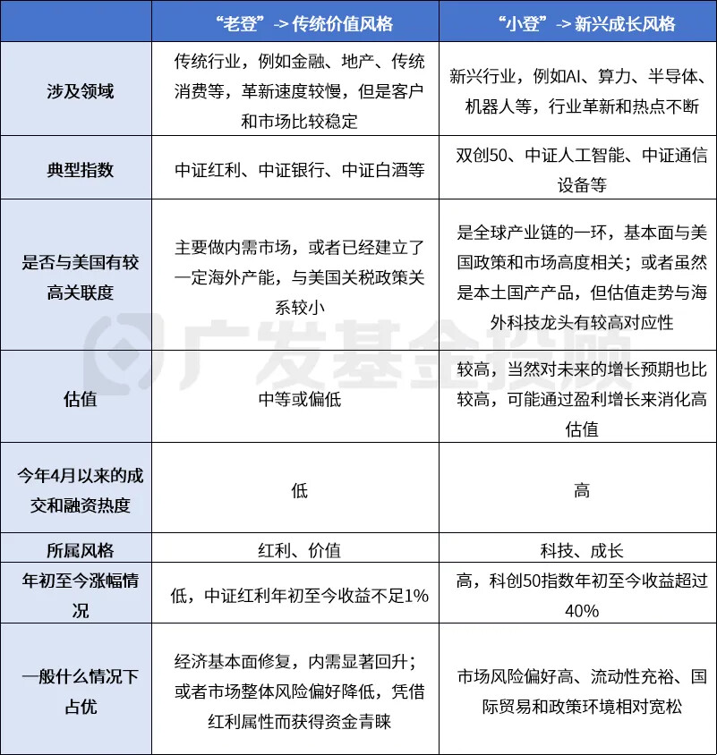 事实上,网络上所谓的“老登”和“小登”资产,用更专业、更准确的语言来描述的话,可理解为传统价值型资产与新兴成长型资产之间的区别,我们也用一张图为大家做了总结: