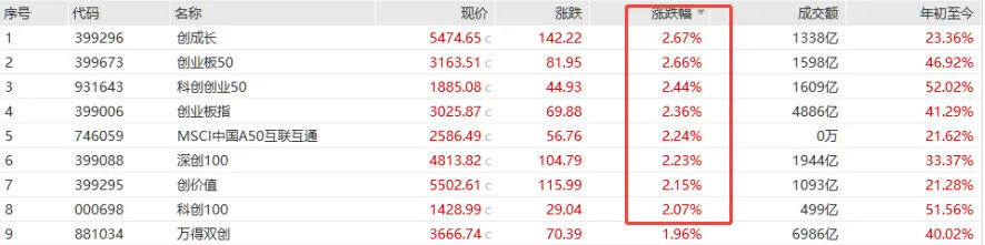 上证指数涨1.22%报3912.21点,深证成指涨1.73%,创业板指涨2.36%,科创50涨1.4%,万得全A涨1.49%。