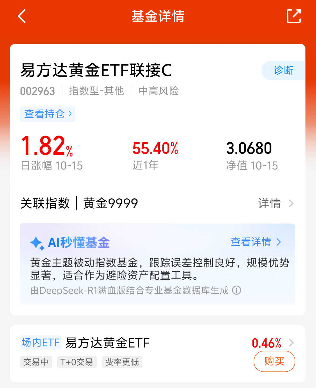 黄金太强了,今天继续创新高了,市场普遍预期美联储10月底会议再次降息,国际金价突破4200美元/盎司关键价格,吸引了大量资金涌入,长期看好黄金,今天继续加仓$易方达黄金ETF联接C(OTCFUND|002963)$,近一月涨了15.40%,近一年涨了55.40%,我准备长期拿着了!