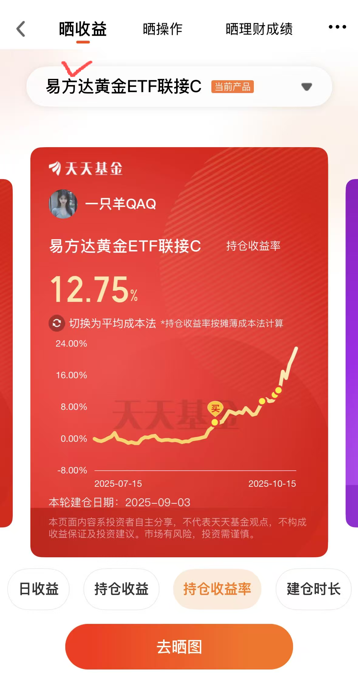 各位黄金主理人,头晕不哈哈!现货黄金差不多站稳4200了,鲍威尔的讲话+褐皮书的发布,市场普遍预期美联储10月底会议再次降息,算铁板钉钉的事儿了。四季度这波,我继续看好黄金!$易方达黄金ETF联接C(OTCFUND|002963)$我的收益率12.75%,中间也是有追涨,大宗的行情不要轻易说顶,我们追随即可!