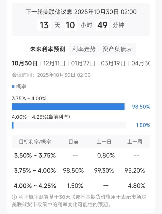 聊贵金属也绕不开美联储降息这条核心主线,年内的10月和12月降息概率分别为98.50%、91.10%,这两次降息是跑不了的,年内依旧还是保持乐观。不过长期来看,本轮美联储降息大结局很可能是3.1厘米,不断持续新高后,或许也要上演万物皆周期剧本,有涨也有跌。
