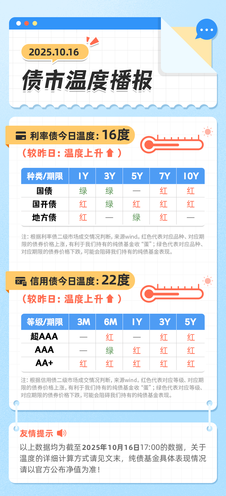 温度设定从0度开始,1个红色格子=温度提升2度。假设当天信用债市场的15格子中,有5个格子是红色,10个格子是绿色,那么当天信用债市场的温度为10度,利率债温度计算同理。
