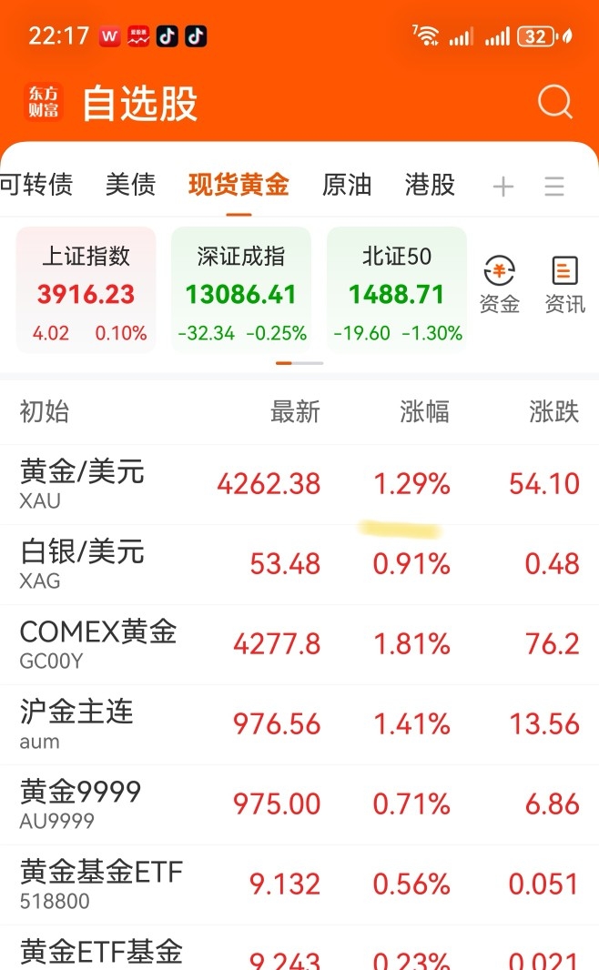 在今天晚上22点17分,观察现货黄金是涨+1.29%