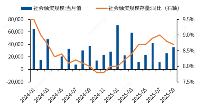 社融数据来看,增速继续下滑。9月新增社融3.5万亿元,同比少增2297亿元,社融增速下降0.1个百分点至8.7%,连续两个月下降,整体表现一般。人民币贷款新增1.29万亿元,同比少增3000亿元,政府债券融资同比少增3471亿元,表现也不强。基数上升了,政府债券融资对社融增速的支撑也减弱了。