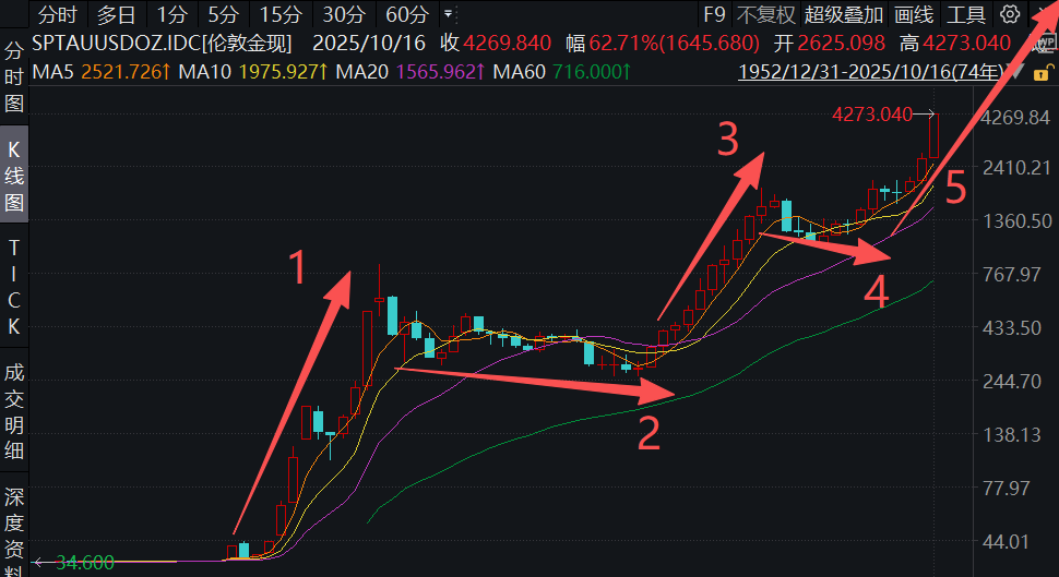 然后就是目前眼下的这一轮上涨,可以认为从2015年开始,也可以认为从2018年(最低跌到过1160)开始。我们比较倾向于从1160开始算,因为2018年的贸易战可能是世界秩序重构的标志性事件,而秩序的混乱重构正在越发明显地成为推动黄金上涨的首要因素。