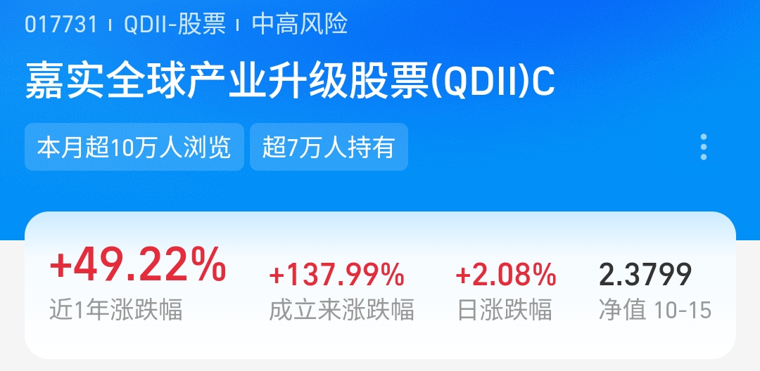 $嘉实全球产业升级股票发起式(QDII)C$ 这表现绝了,近一年49.22%的涨幅,昨天又涨2.08%,选的都是硬核科技股,长期持有稳,我继续拿着等吃肉