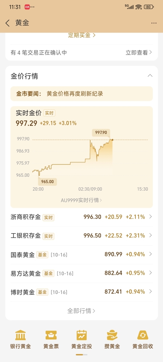 黄金又创新高了,今天小小继续上车$嘉实上海金ETF发起联接C$ 早盘黄金高开高走,目前为止估值涨幅3.01%,金价997.29,估计又要吃肉了。