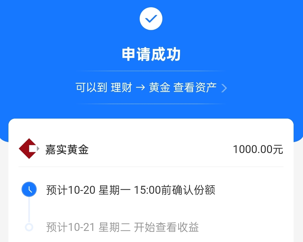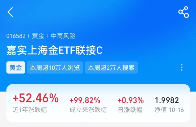 我今天也是布局了$嘉实上海金ETF联接C$,它的业绩还不错,近一年收益率 52.46%,在同类中排名靠前,而且从当前市场环境来看,支撑黄金走稳的因素仍在,后续行情依旧具备值得期待的空间,因此我对黄金接下来的表现会继续保持看好的态度,今天顺势上车,期待它后面的表现!