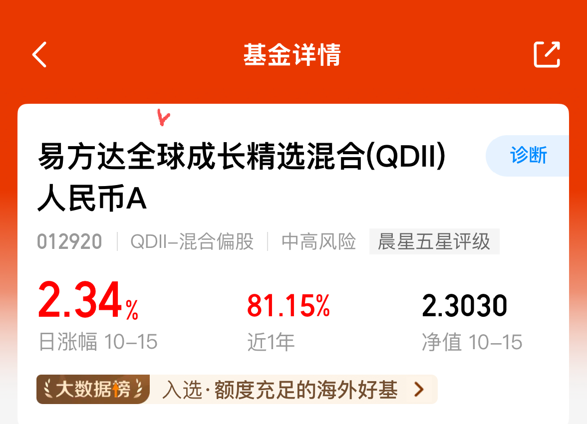 昨天美股三大指数调整,本来高开的,盘中因为个利空最后收跌了,主要就是银行业的暴雷。但是我还是坚持美股长期向好的态度,但是也不会all in,$易方达全球成长精选混合(QDII)人民币C(OTCFUND|012922)$昨天更新收涨2.34%,近一年81.15%,这个基是可以投A股,也可以投美股,还能投H股,全球科技混合这个思路,市场上这种基不多。另外额度这方面,关注的友友应该发现了,很多纳指100的QDII基限购了,易方达全球基额度空间还比较大。