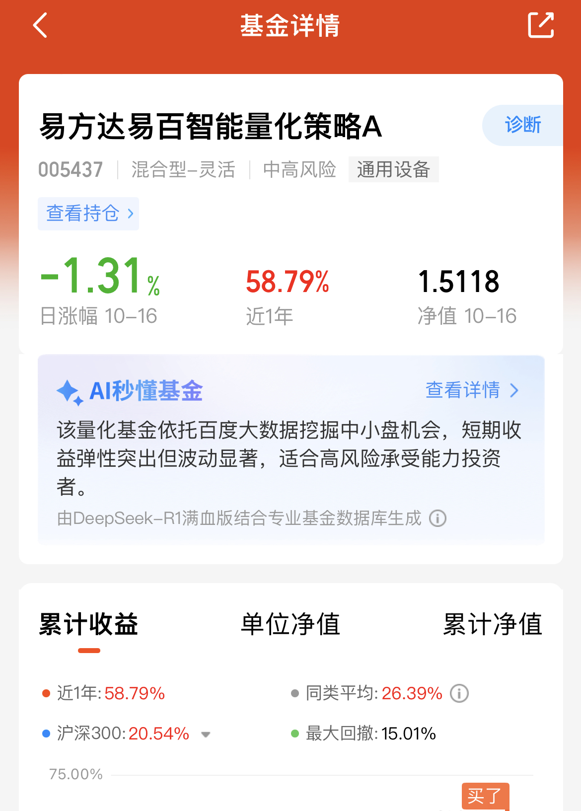 今日市场板块轮动依旧快,消费、科技涨跌切换,单押赛道太难。打算加仓$易方达易百智能量化策略A(OTCFUND|005437)$,它靠智能模型选股,不凭主观判断,震荡市里更灵活。这只基业绩也不错,近半年涨36.83%、近一年飙至58.79%,远超不少主动基金。持仓分散在多行业,既能抓热门机会,又能降单一行业风险。基金经理有8年量化经验,模型迭代成熟,今天继续补仓,借量化之力稳稳跟行情。