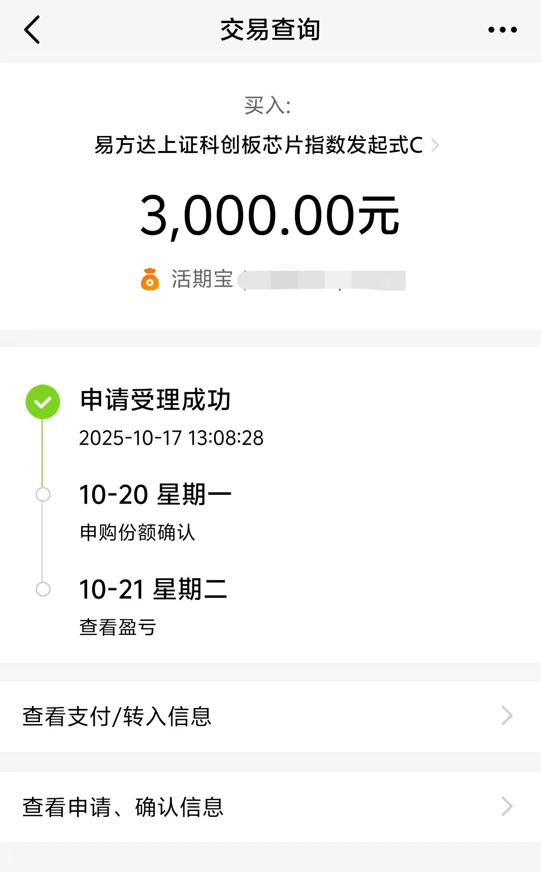 大盘今天震荡调整,科创芯片板块今天小幅回调,这个方向长期来看发展前景还不错,后免一旦有人工智能鑫的热点催化,上涨空间还是挺大的,趁着回调今天加仓$易方达上证科创板芯片指数发起式C(OTCFUND|020671)$3000元,近三个月涨了53.56%,近一年涨了93.65%,业绩还不错,长期看好这个方向,我准备分批加仓了!