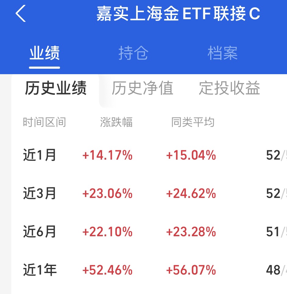 黄金延续上涨行情,盘中最高涨幅超4380美元/盎司,涨幅接近1.3%,十月开始黄金的涨幅就多次创下记录,年内也是惊喜较多,已创下45次新高,避险资产的光芒持续闪耀。$嘉实上海金ETF发起联接C$ 密切跟踪上海金,与国际金价的黄金相比,它更能反映国内黄金的供需关系。该基金连续上涨四天,近一年上涨52.46%,阶段收益波动较低,购入0费率,买入卖出七天没有手续费,费率较低,申赎灵活,长期持有的话,大大降低了投资成本。今天A股、港股、美股全球市场震荡走弱,黄金持续走强,就连央行都连续增持11个月,避险需求和黄金价值凸显,未来黄金的走势我认为还很广