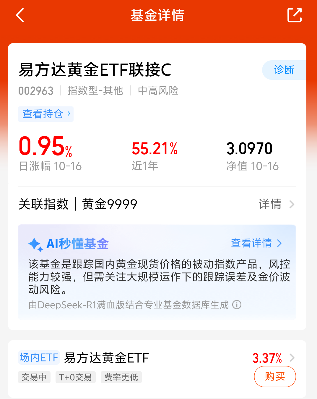 黄金太强了吧,今天继续创新高了,黄金在避险情绪支撑下一路走强,现货黄金今天早盘都突破1000元了,$易方达黄金ETF联接C(OTCFUND|002963)$近一周涨了6.01%,近一个月涨了15.09%,近三个月涨了24.54%,近一年涨了55.21%,长期看好黄金,我准备定投加仓,长期拿着了!